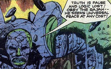 In the comic, a likeness of Dr. Strange, who’s one of The Defenders himself, emerges from the ground and says ominously, “Truth is false and logic lost! Obey the Rajah—he seeks universal peace at any cost!”