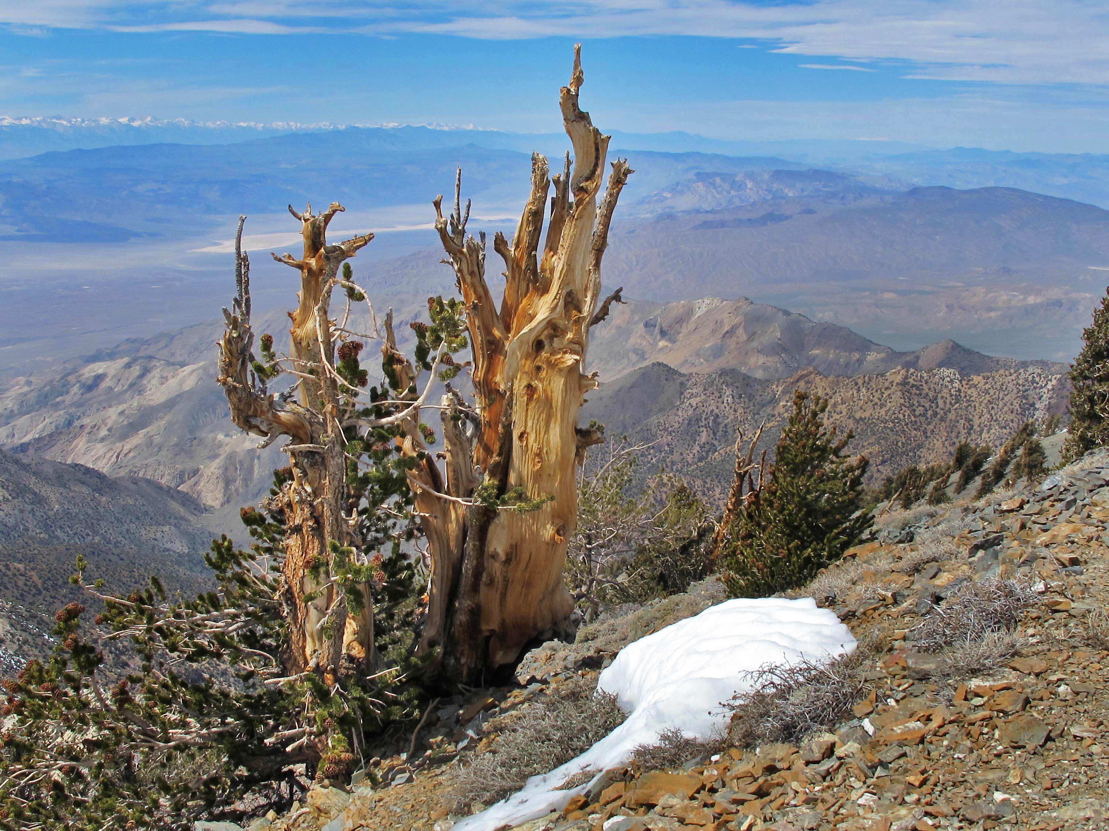 Setting the ghost towns and abandoned mines against the wind and the pines creates an interesting contrast, because the towns and mines, like so many of our problems, are man-made, transient and ephemeral, while the wind and the pines are permanent, the very stuff of the earth. Although you might not think of pines as permanent in the same way that wind is, the metaphor works because they’re remarkably durable. The bristlecone pine, which is one of the few things to grow on Telescope Peak, are among the oldest living plants on earth, with some of them more than 5,000 years old.